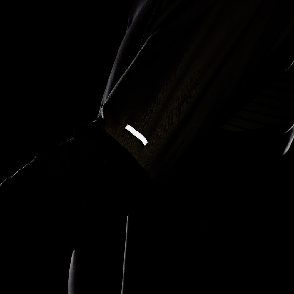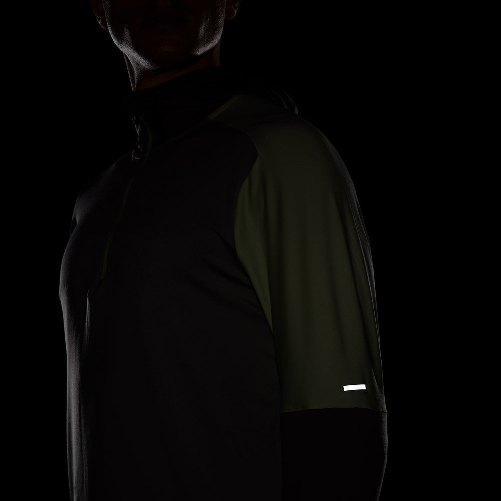 В этой модели предусмотрен капюшон, посадку которого можно регулировать с помощью шнурков. Светоотражающие элементы повышают безопасность тренировок в темное время суток.