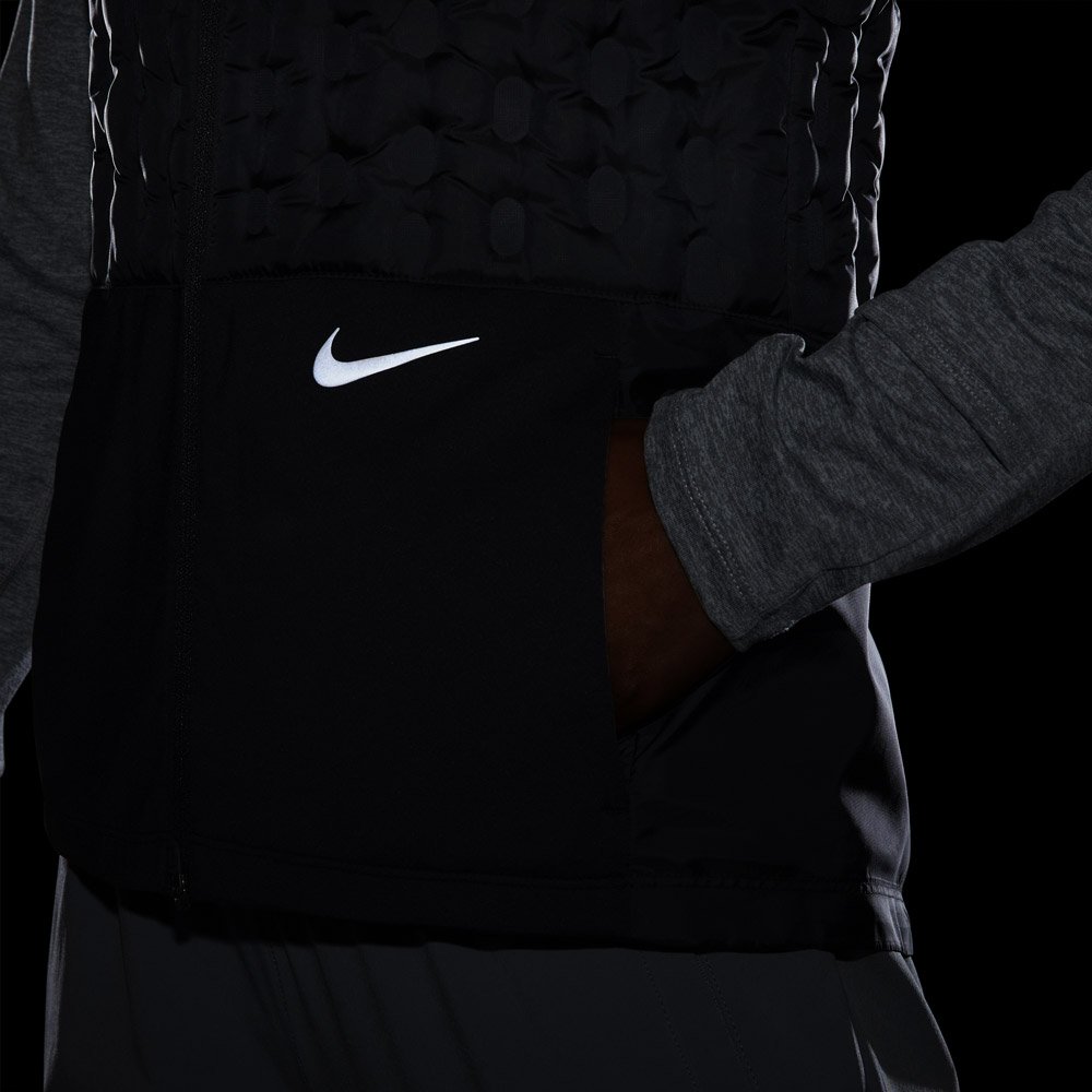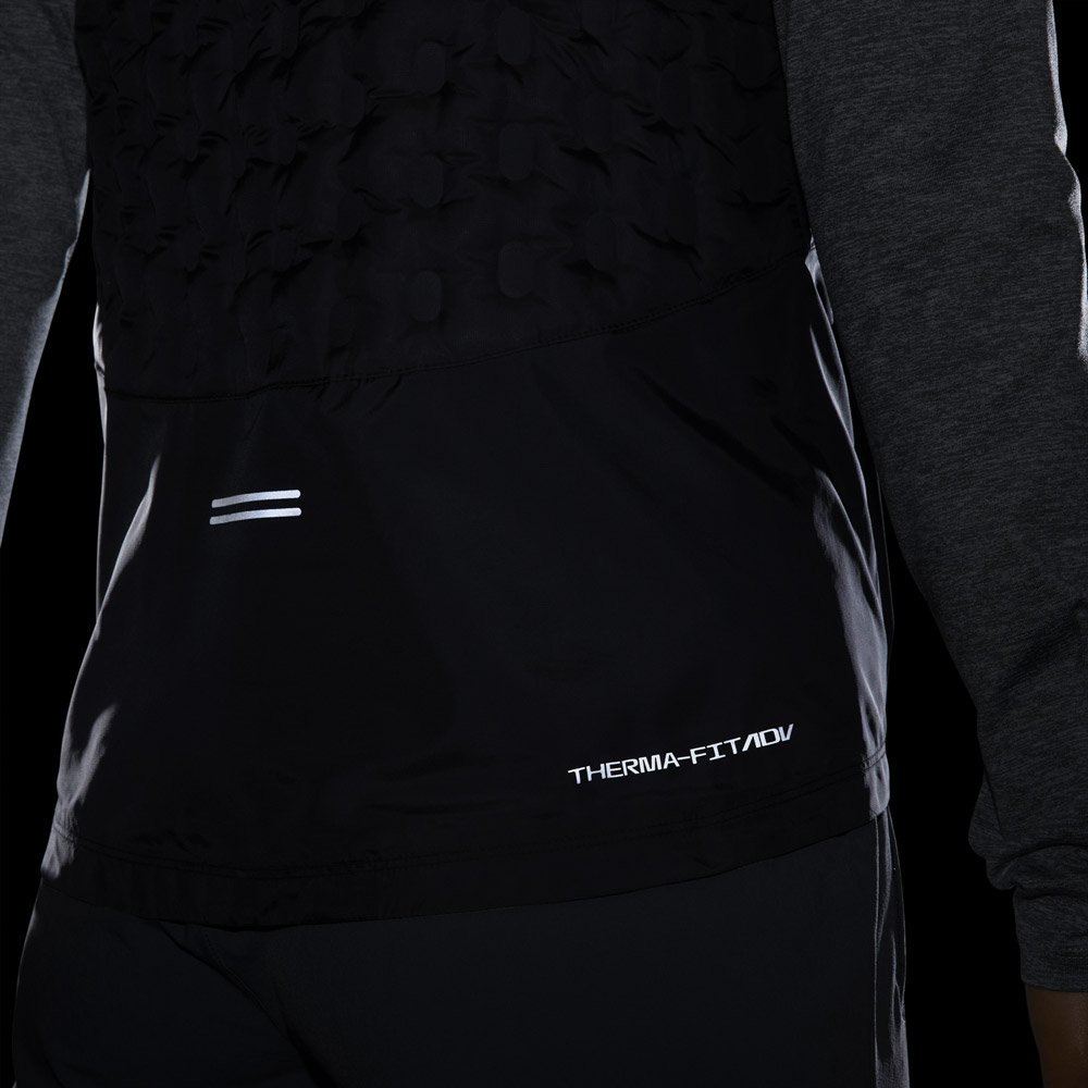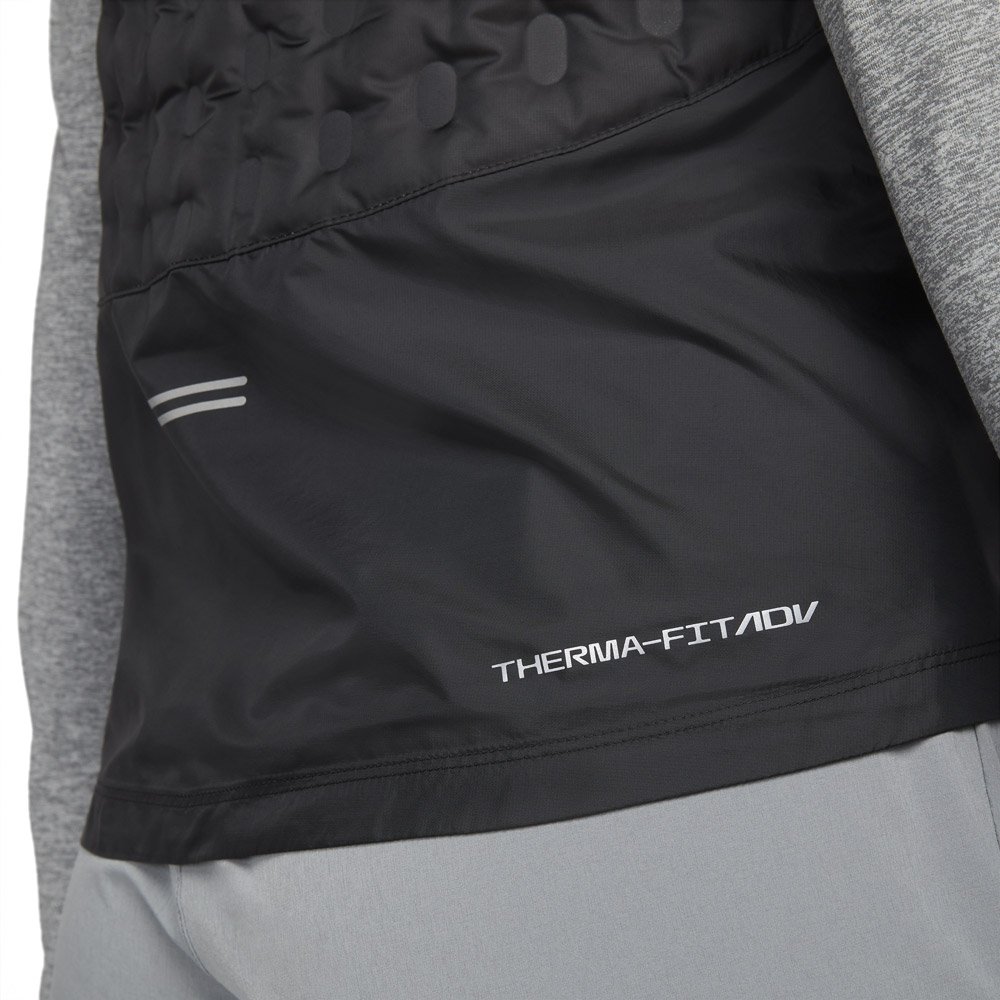 Спереди и сзади предусмотрены специальные вставки с пуховым наполнителем и пером для дополнительной защиты от мороза и ветра. Терморегулирущая ткань с технологией Nike Therma-FIT ADV поддерживает комфортную температуру тела во время пробежки. Благодаря долговечному водоотталкивающему покрытию наполнитель не сбивается.