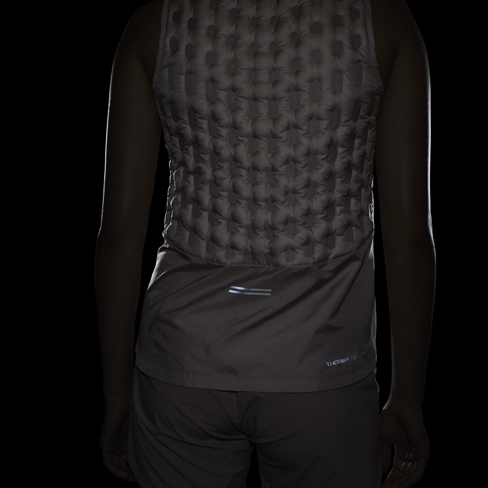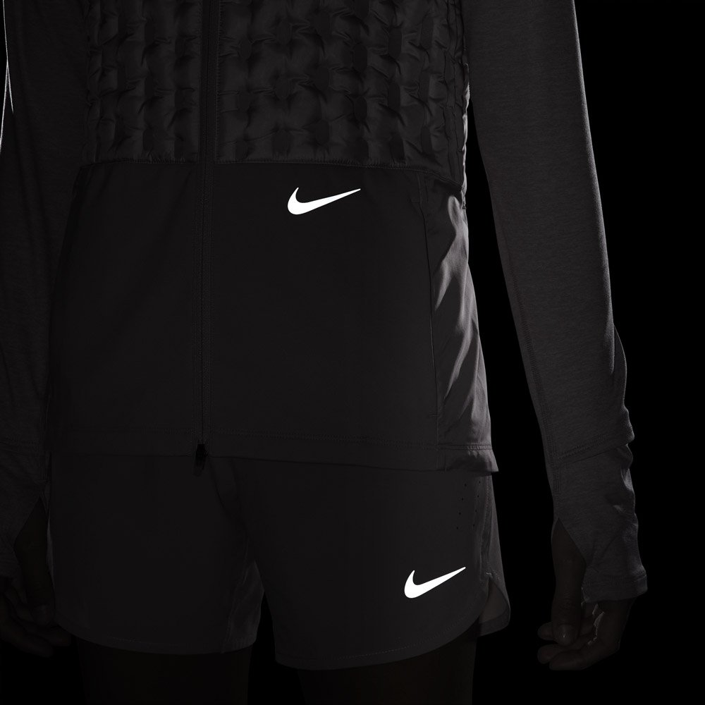 Спереди и сзади предусмотрены специальные вставки с пуховым наполнителем и пером для дополнительной защиты от мороза и ветра. Терморегулирущая ткань с технологией Nike Therma-FIT ADV поддерживает комфортную температуру тела во время пробежки. Благодаря долговечному водоотталкивающему покрытию наполнитель не сбивается.