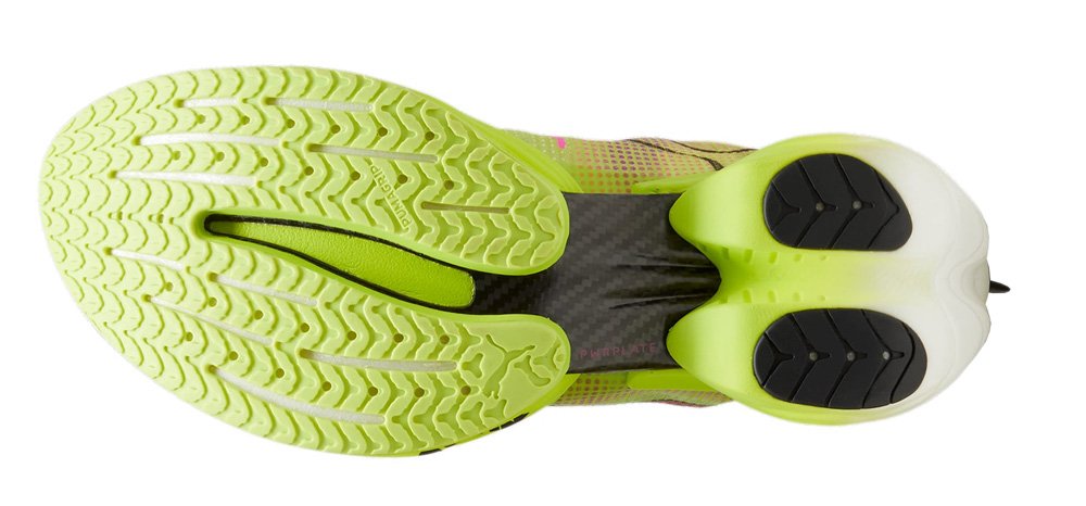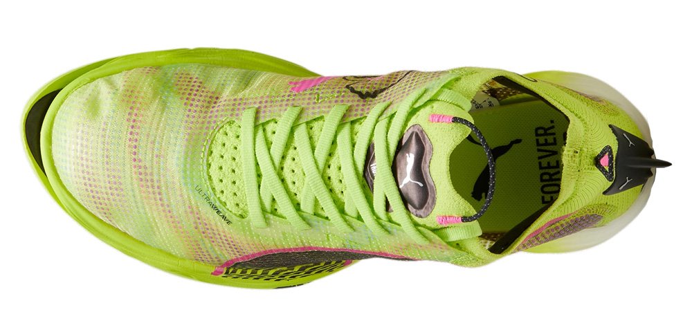 Верх обуви изготовлен из сверхлегкого и прочного материала UltraWeave, усиленного в местах повышенного давления синтетическими накладками PWRTape. Подошва из легкой резиновой смеси PumaGrip обеспечивает превосходное сцепление с трассой в сухих и влажных условиях.