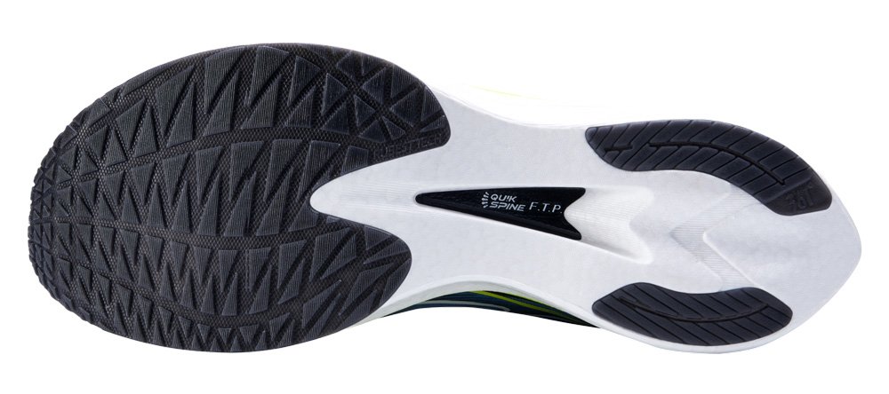 Промежуточная подошва из нейлонового эластомера QU!KFLAME смягчает удары и обеспечивает стабильность во время бега. Эта пена чрезвычайно упругая, она на 45% легче традиционного материала EVA, но при этом сохраняет отзывчивость. В межподошву встроена гибкая пластина QU!KSPINE FTP, которая помогает повысить эффективность бега, проталкивая вас вперед. В перед