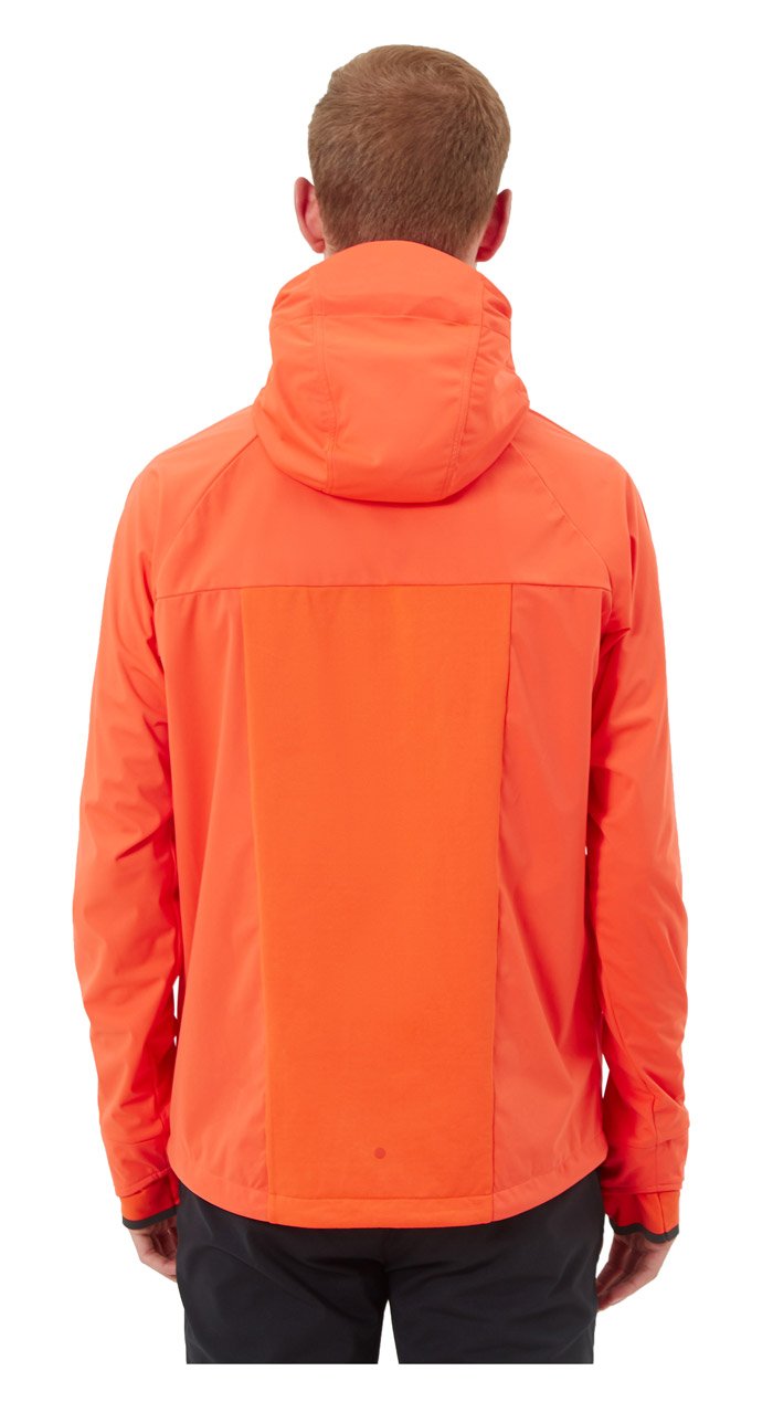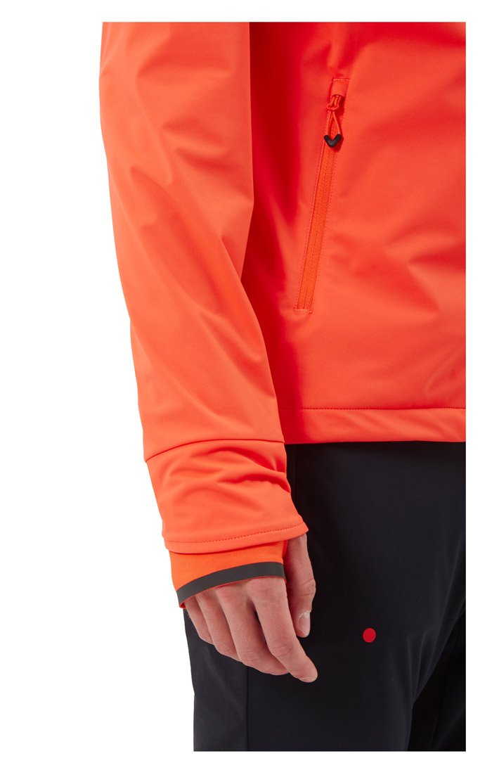 Мужская куртка для бега в холодный период года. Модель защищает от ветра и влаги, так как сшита из мембранной ткани с защитой от воды 10000 мм и паропроницаемостью 10000 г. На спине вставка из эластичной лайкры с микрофлисом, поэтому куртка хорошо дышит и не сковывает движений.