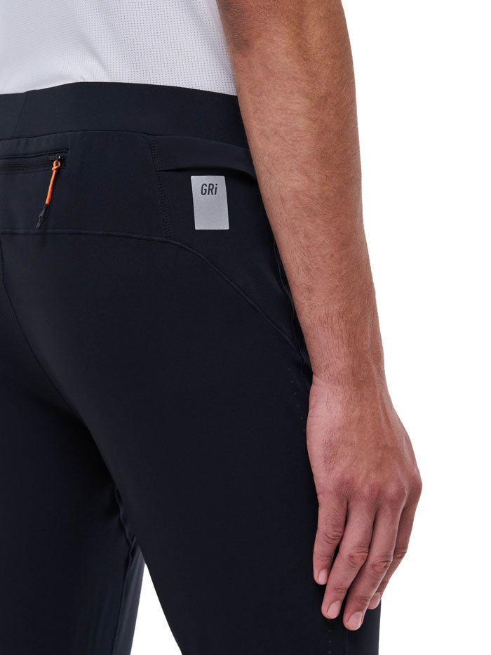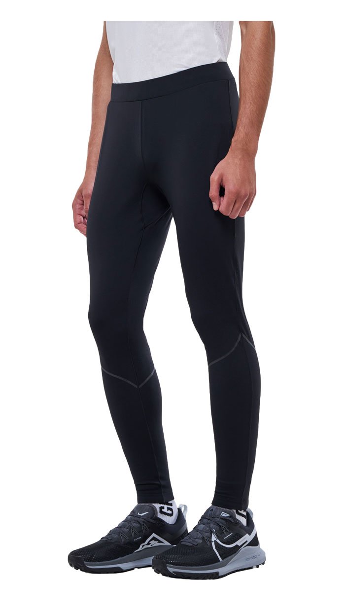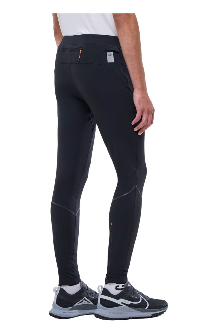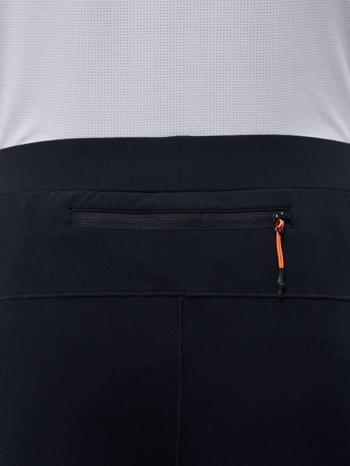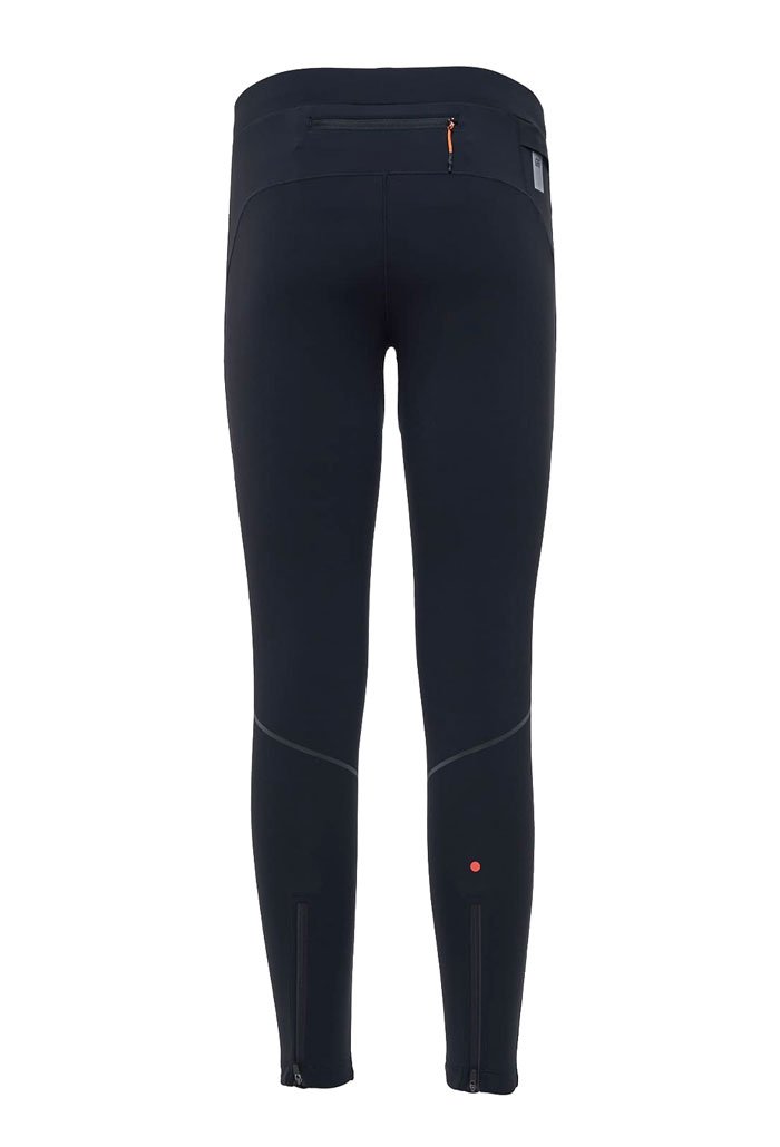 Пояс оборудован шнурком для регулировки посадки. Снизу расположены молнии, чтобы тайтсы было удобно надевать и снимать. В заднем кармане на молнии удобно хранить телефон, рядом с ним расположен карман с клапаном для мелочей. Светоотражающие элементы на голенях повышают видимость, когда на улице темно.