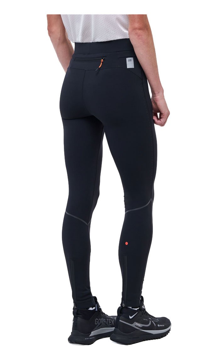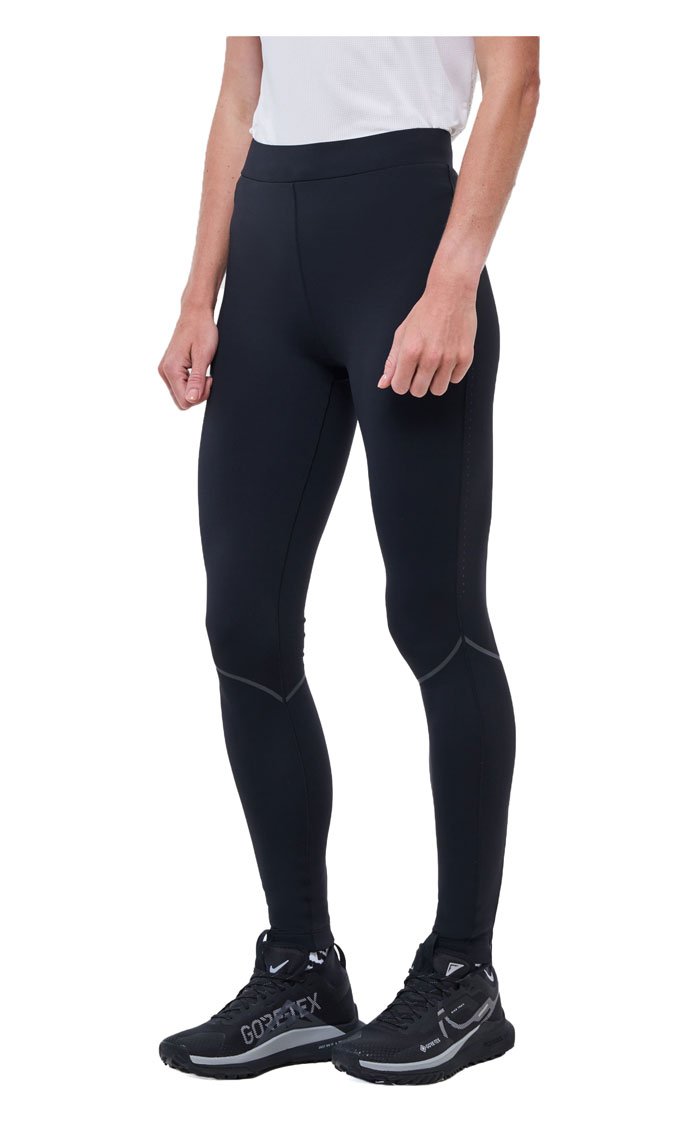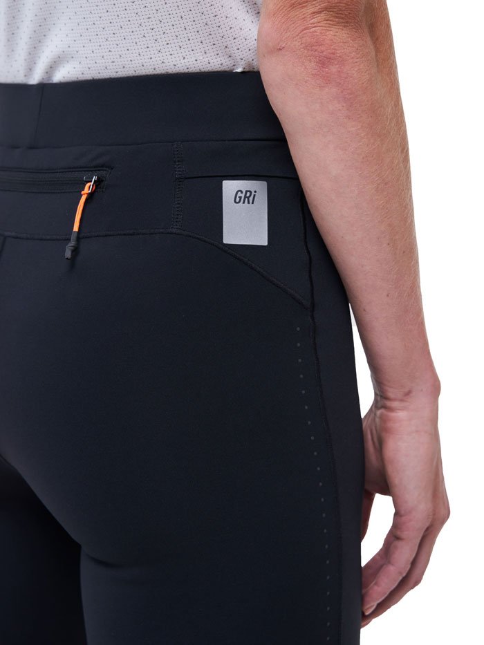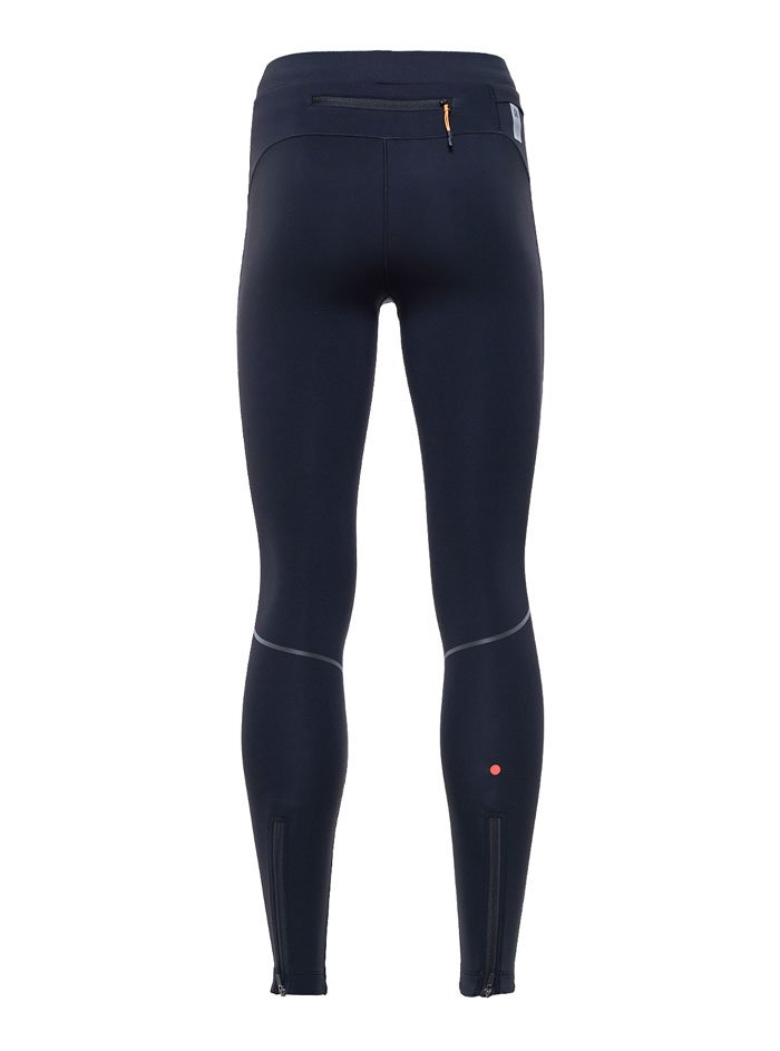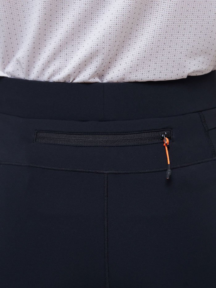 Пояс оборудован шнурком для регулировки посадки. Снизу расположены молнии, чтобы тайтсы было удобно надевать и снимать. В заднем кармане на молнии удобно хранить телефон, рядом с ним расположен карман с клапаном для мелочей. Светоотражающие элементы на голенях повышают видимость, когда на улице темно.