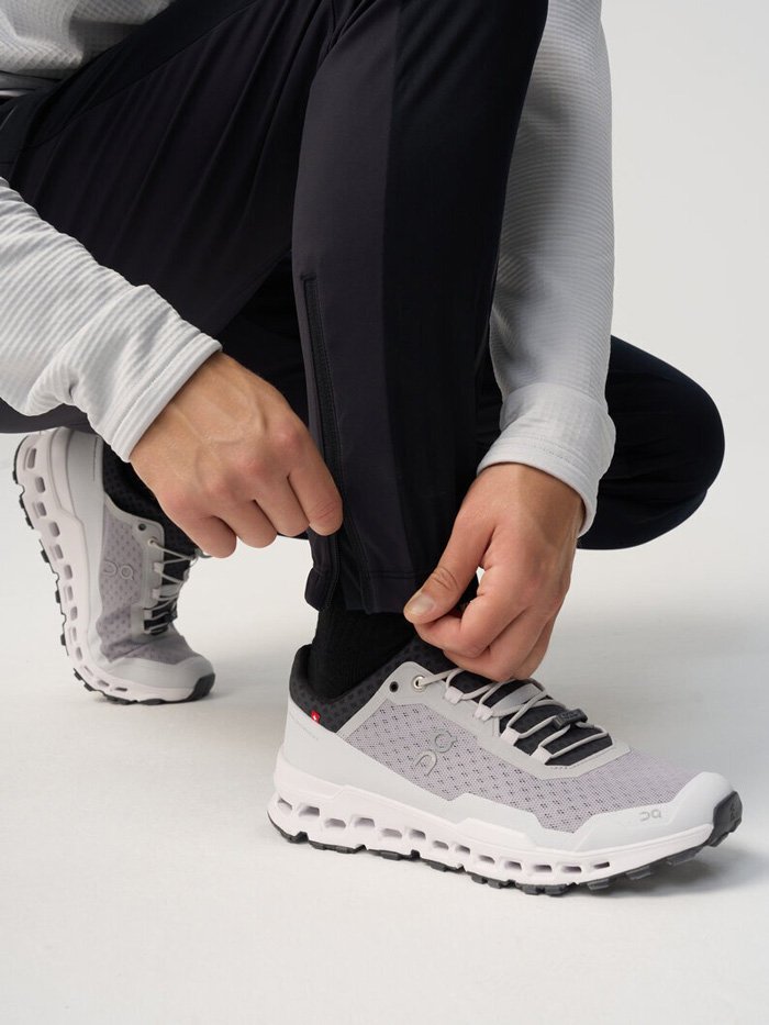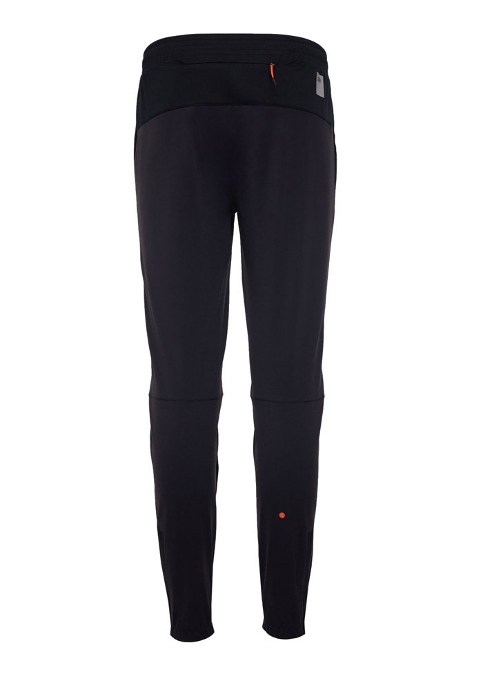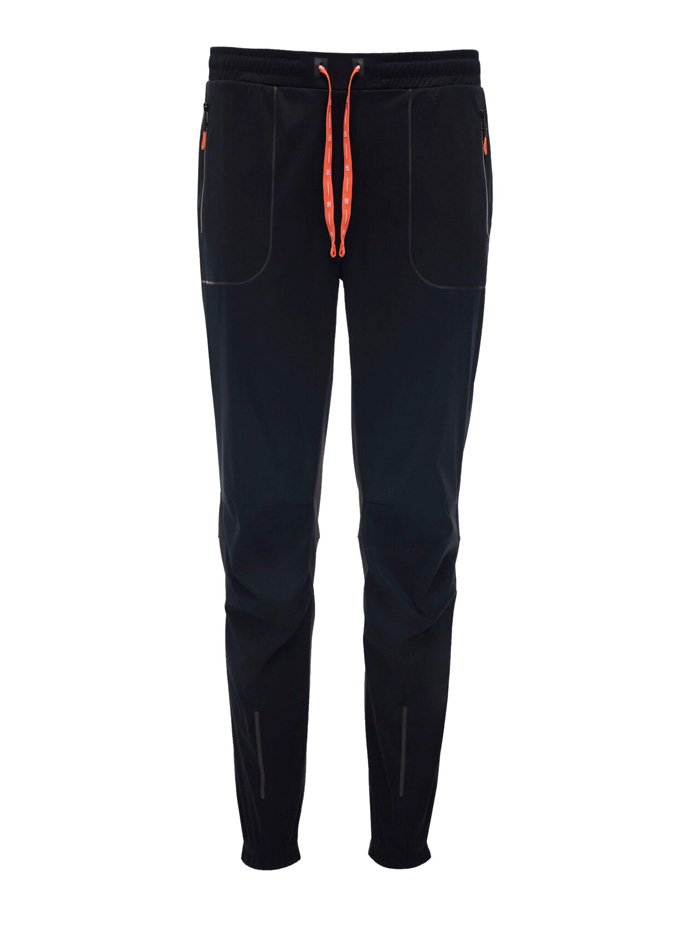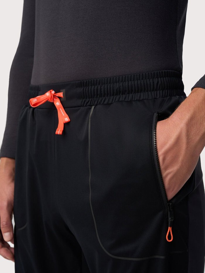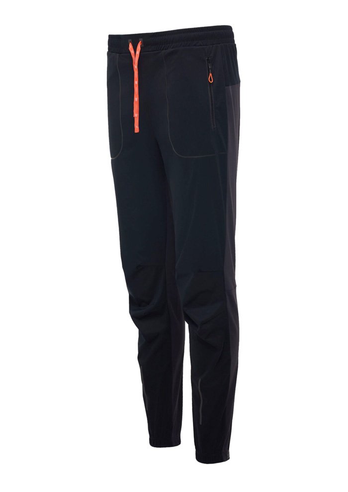 Брюки сшиты из ткани с водоотталкивающей DWR-пропиткой. Передняя часть брюк выполнена из ткани с мембраной 10000/10000, которая отталкивает влагу, сохраняя при этом дышащие свойства. Эластичный пояс оснащен регулирующим шнурком, который позволяет подогнать штаны по фигуре. Штаны оборудованы несколькими удобными карманами на молниях для хранения телефона и мелочей - два сбоку и один сзади.
