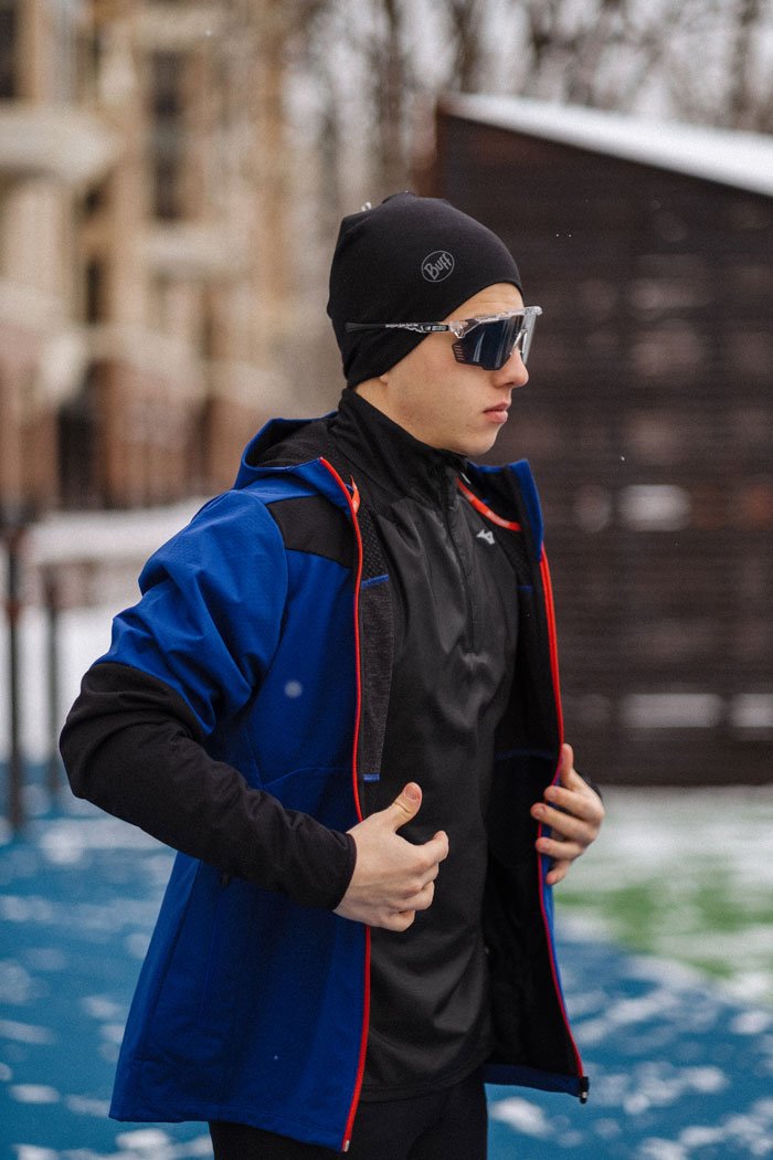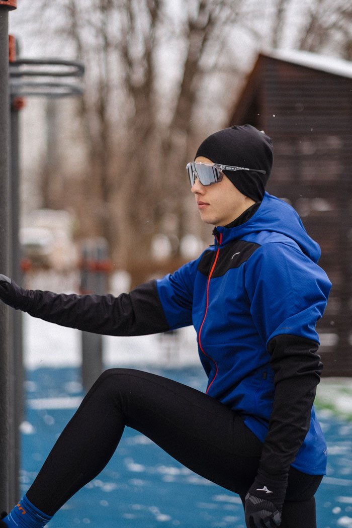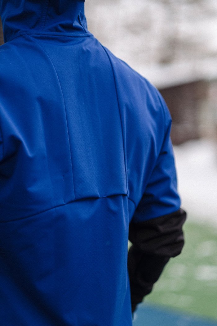 Куртка оснащена молнией по всей длине с защитой подбородка. Регулируемый капюшон и высокий воротник-стойка защищают от холода и ветра. По бокам расположены два кармана на молнии, в которых можно разместить необходимые на пробежке мелочи. На спине предусмотрены вентиляционные прорези для воздухопроницаемости. Светоотражающие элементы повышают видимость в темное время суток.