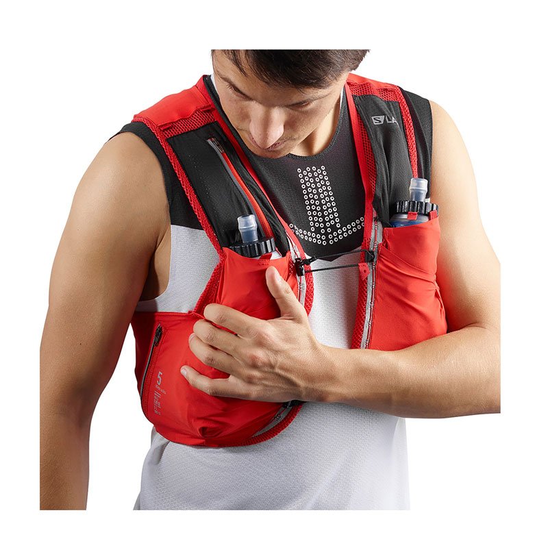 Впереди на лямках симметричные карманы с гибкими фляжками, объемом 500 мл. Кроме этого на каждой стороне имеется по два вместительных кармана из эластичной ткани, компактный карман для мелочей и карман на молнии.