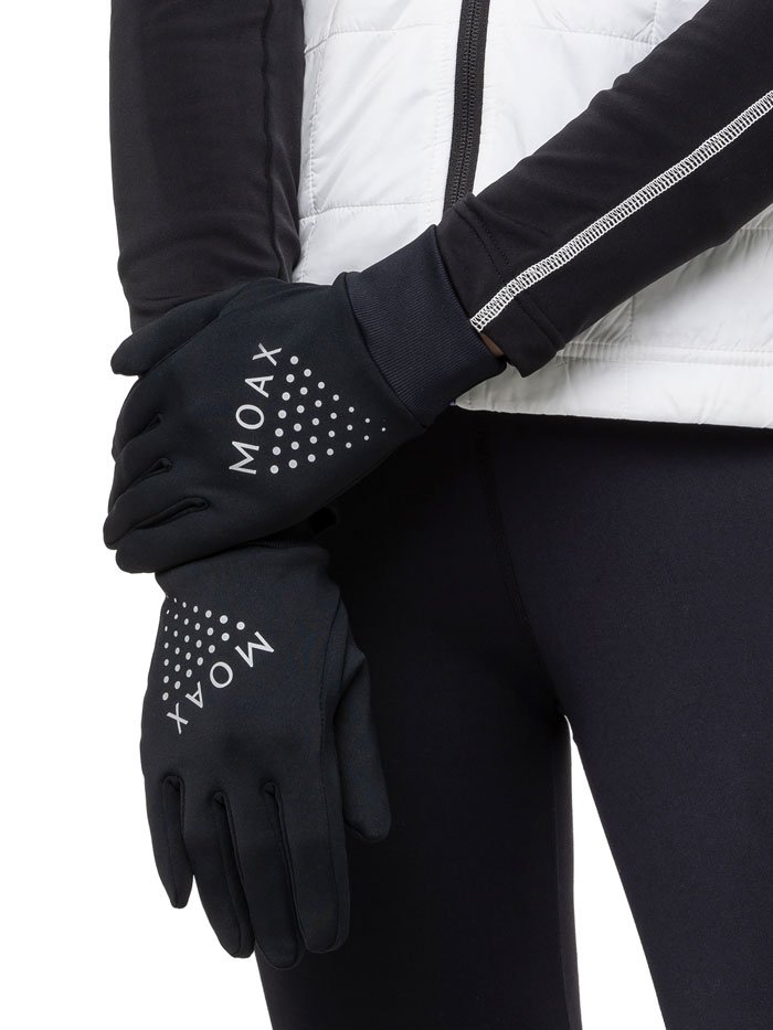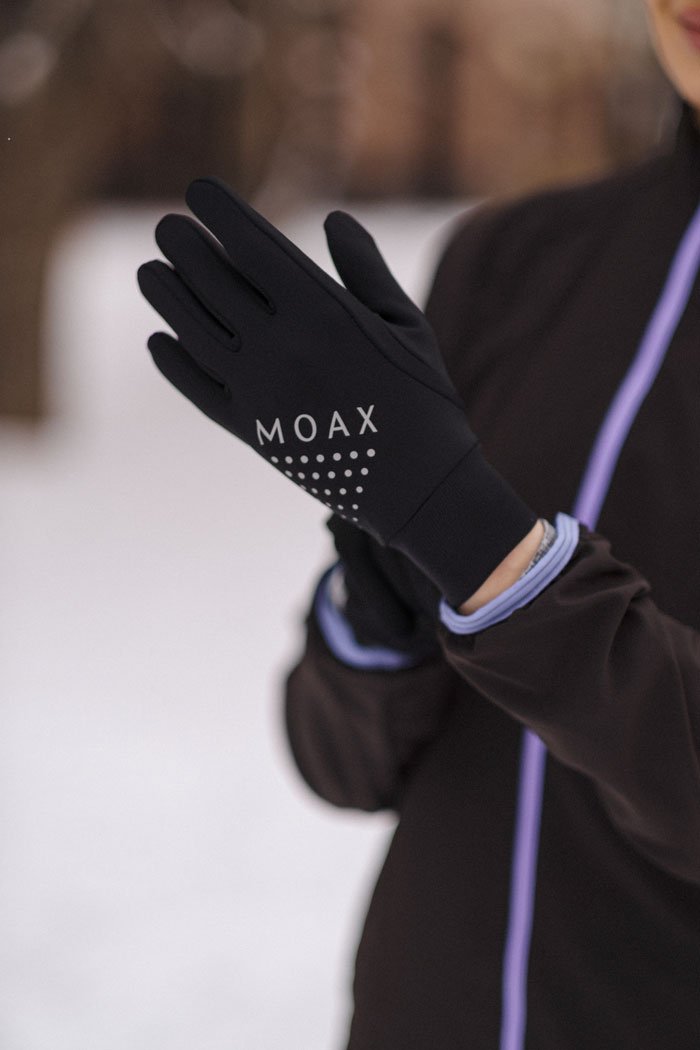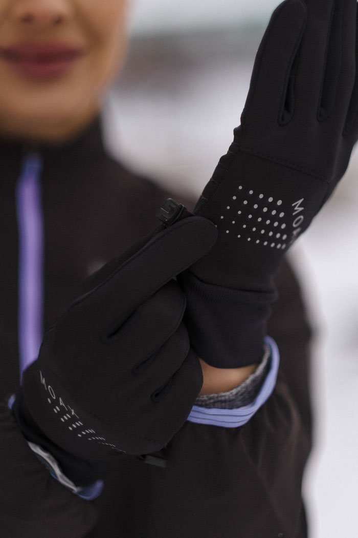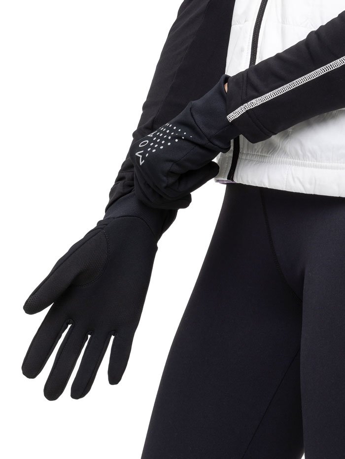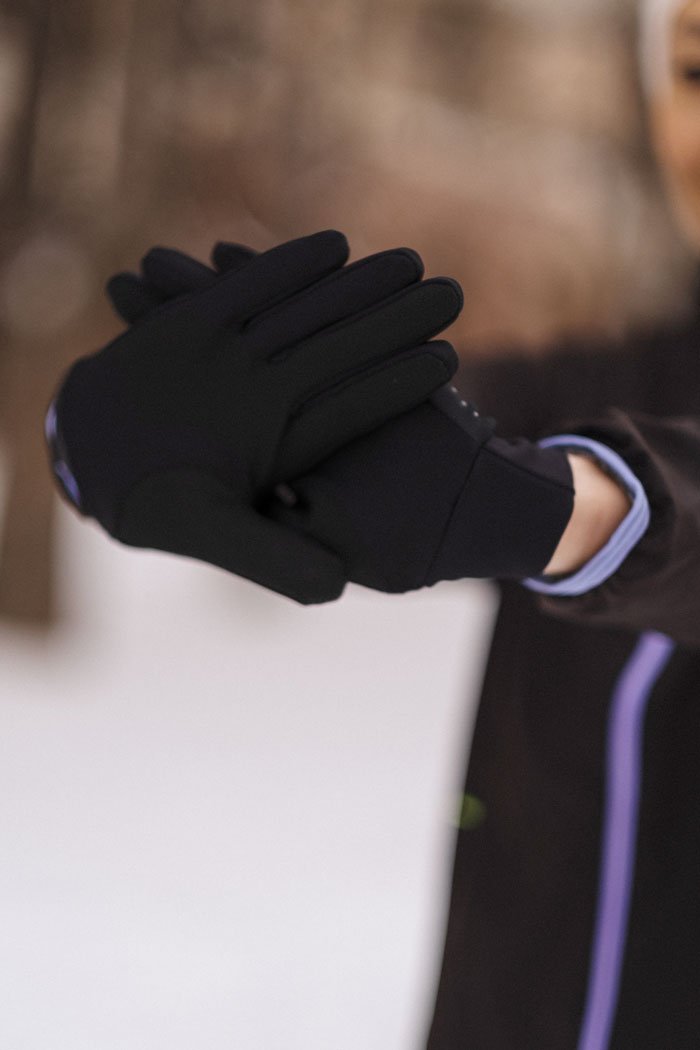 Перчатки для беговых тренировок в межсезонье. Манжеты из трикотажной резинки плотно обхватывают запястья, удерживая тепло внутри и не пропуская холодный ветер. На тыльной стороне ладоней нанесен светоотражающий логотип для хорошей видимости в темное время суток.