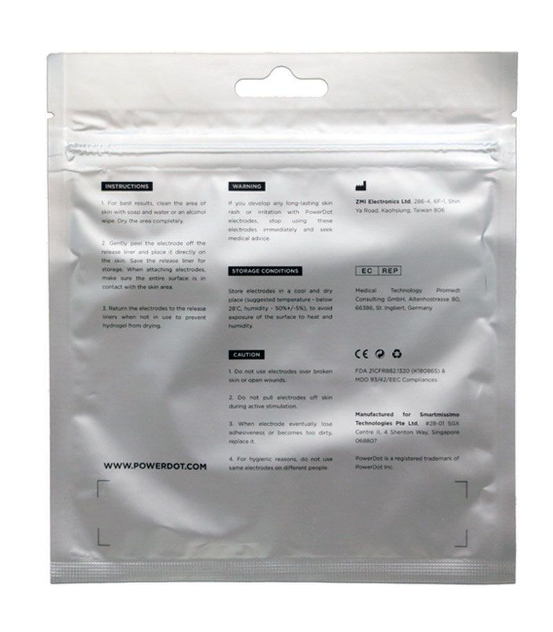В комплект сменных электродов для миостимулятора PowerDot 2.0 входят две прямоугольных и четыре круглых накладки с магнитными защелками для максимально удобного применения на различных участках тела. С их помощью можно провести 25-30 сеансов стимуляции.