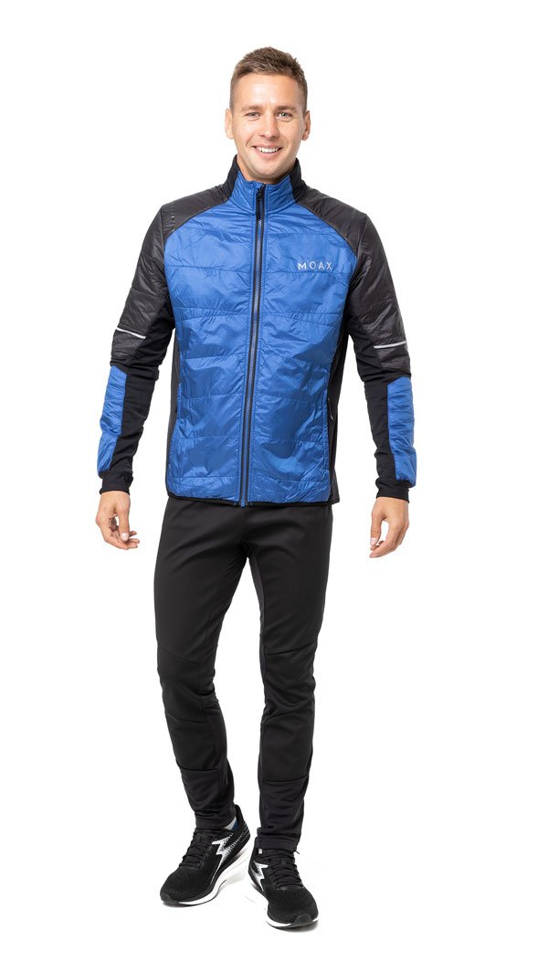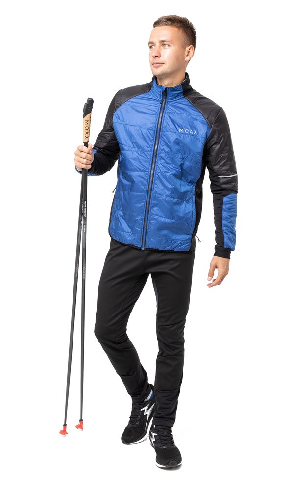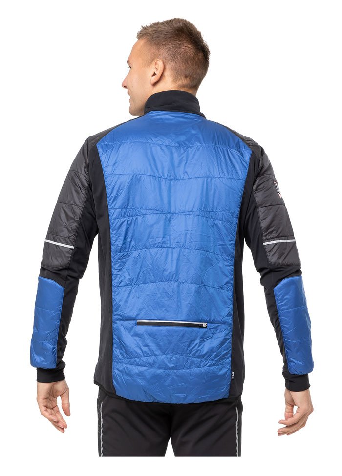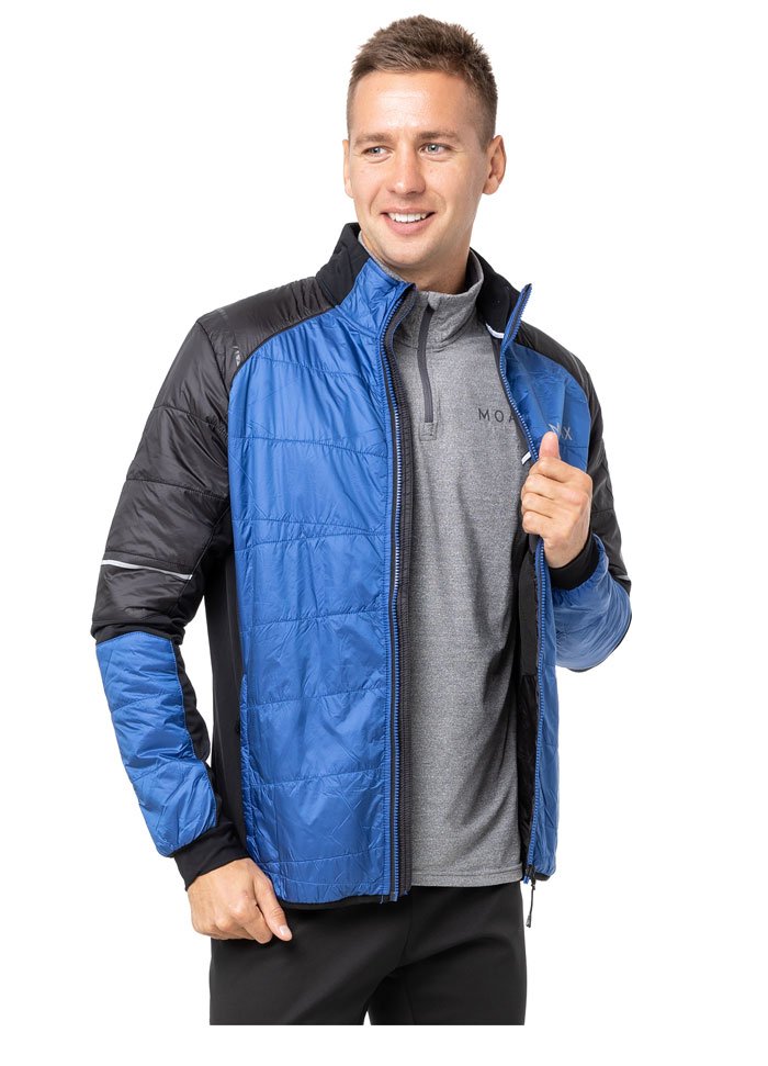 Мужская куртка в стильном дизайне с вставками из стеганого утеплителя на груди и спине имеет гибридную конструкцию: снаружи расположена непродуваемая водоотталкивающая ткань, а по бокам, с внутренней стороны рукавов и на их сгибах использована дышащая эластичная ткань с микрофлисом с изнаночной стороны.