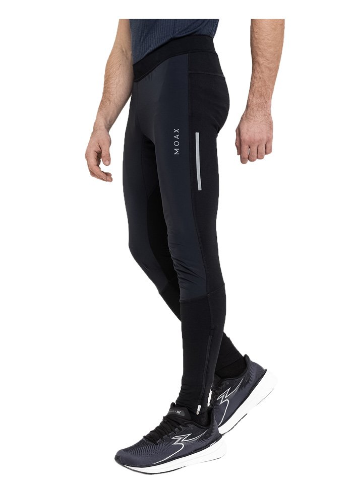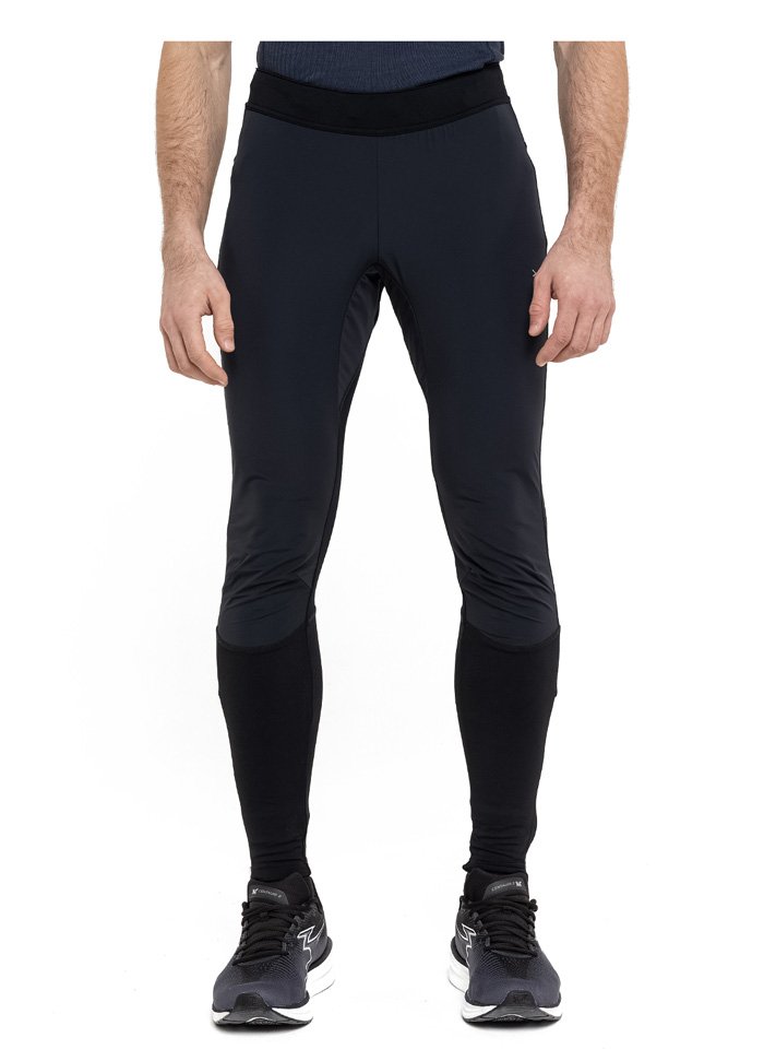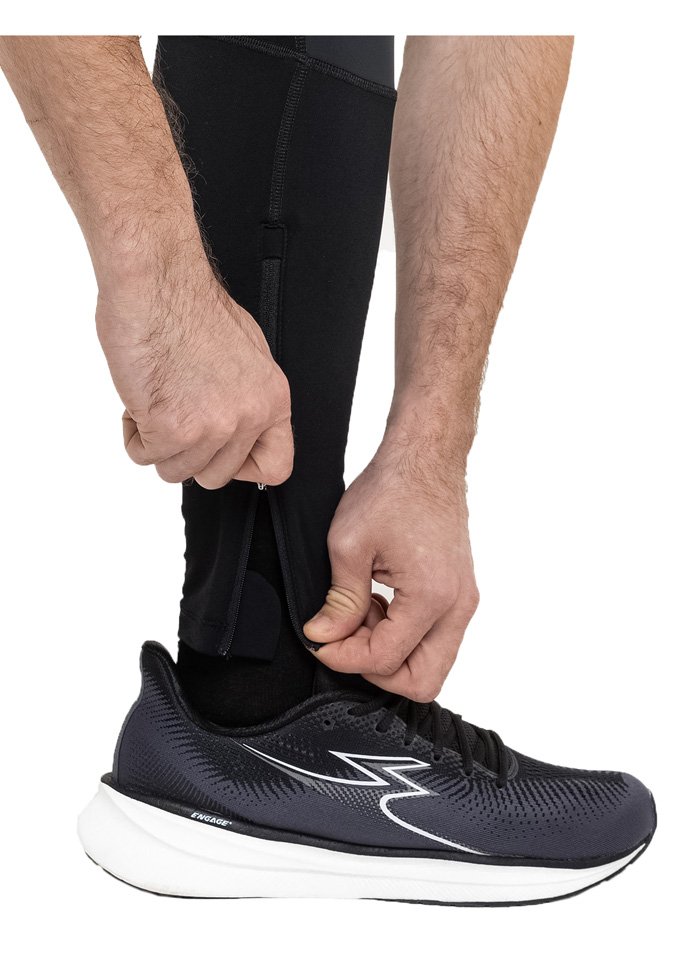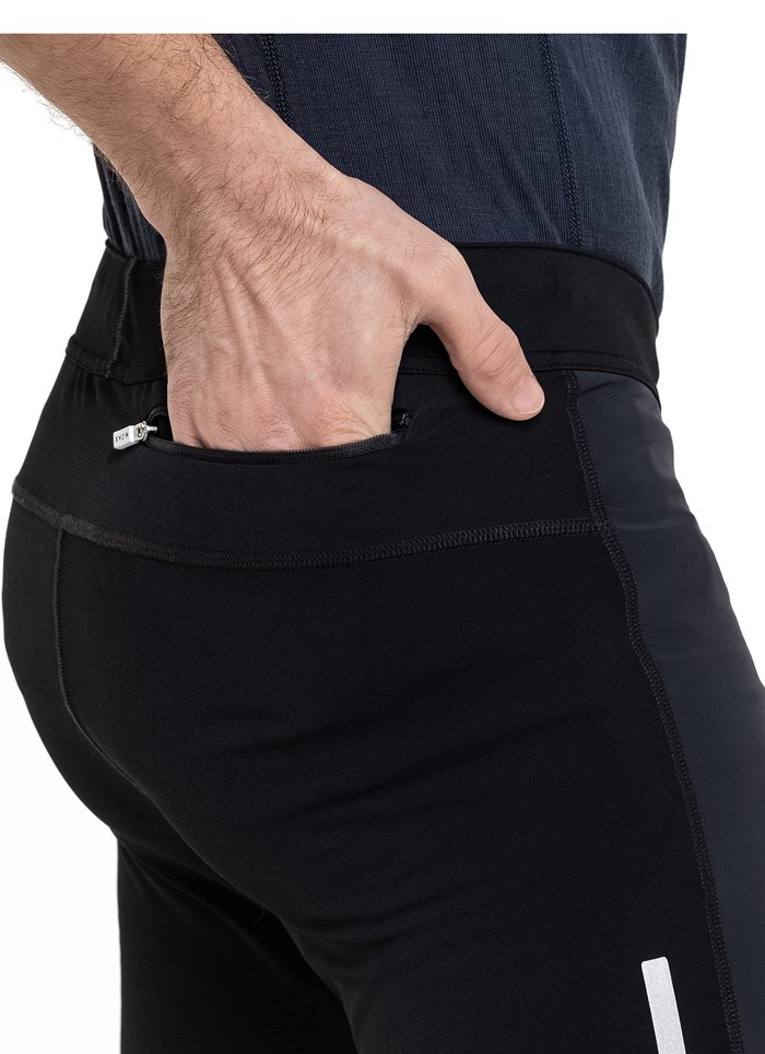 Ветрозащитные панели на передней части тайтсов эффективно блокируют холодный ветер. Пояс с регулируемой посадкой обеспечивает комфортную фиксацию и не давит во время занятий. Задний карман на молнии подходит для хранения ключей, карты или других мелочей. Молнии внизу штанин облегчают надевание и снятие тайтс, особенно поверх обуви. Светоотражающие элементы увеличивают видимость в условиях недостаточной освещенности, повышая безопасность.