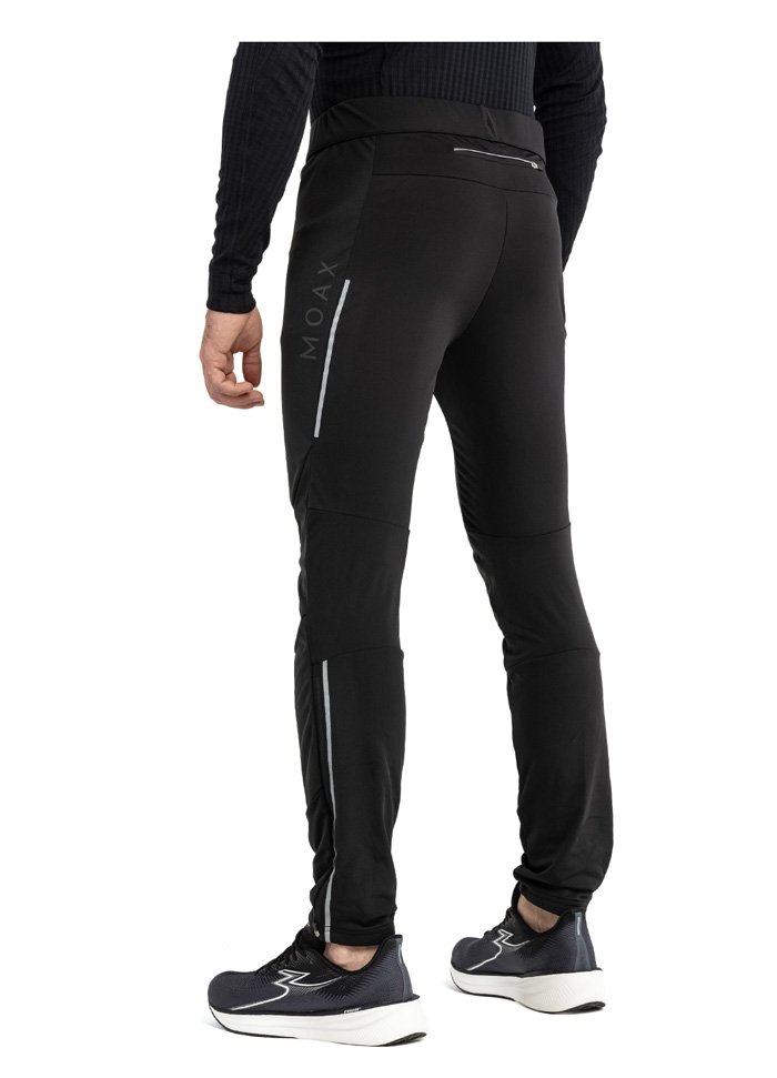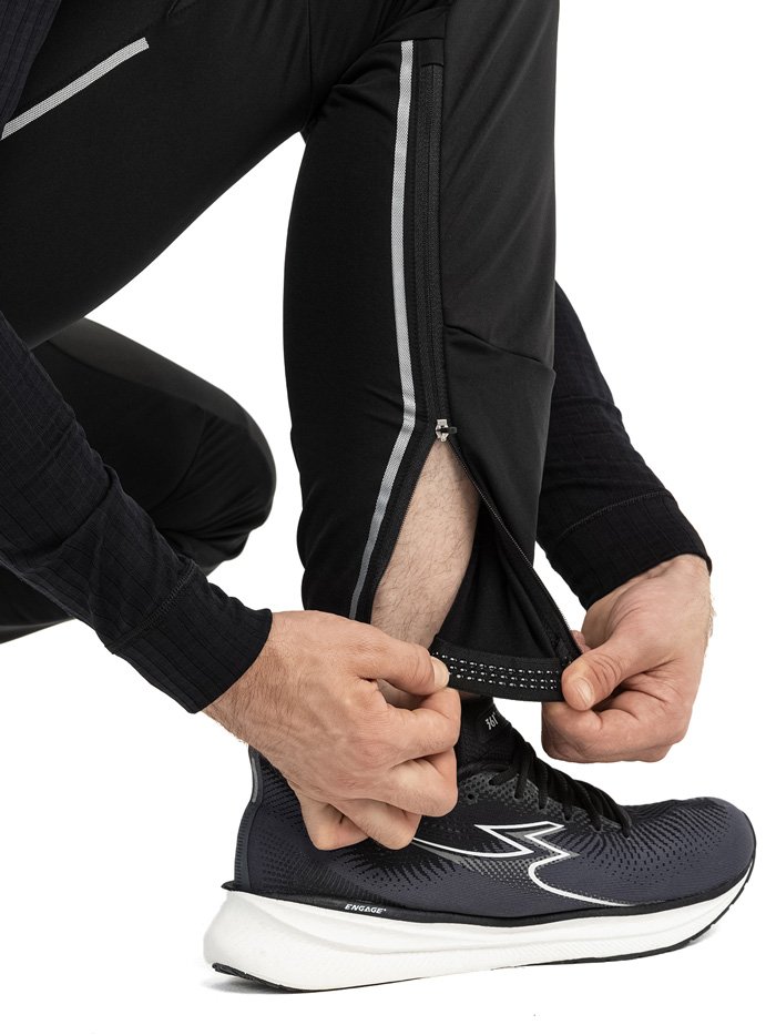 Спортивный узкий крой делает их идеальными для интенсивных тренировок. Задние эластичные панели не ограничивают свободу движений, а удлиненные молнии внизу брючин позволяют легко надевать и снимать штаны. Задний карман на молнии позволяет хранить необходимые мелочи на пробежке. Силиконовые элементы внизу брючин предотвращают их задирание во время движения, защищая от ветра и влаги.
