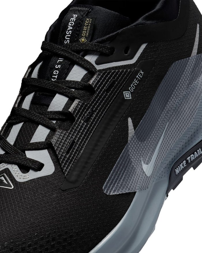 Кроссовки Nike Pegasus Trail 5 Gore-Tex - идеальный выбор для любителей бега по пересеченной местности, которые не боятся непогоды. Водонепроницаемая мембрана Gore-Tex и 3D-принт на носке эффективно защищают от влаги, сохраняя ноги сухими в дождливую погоду.