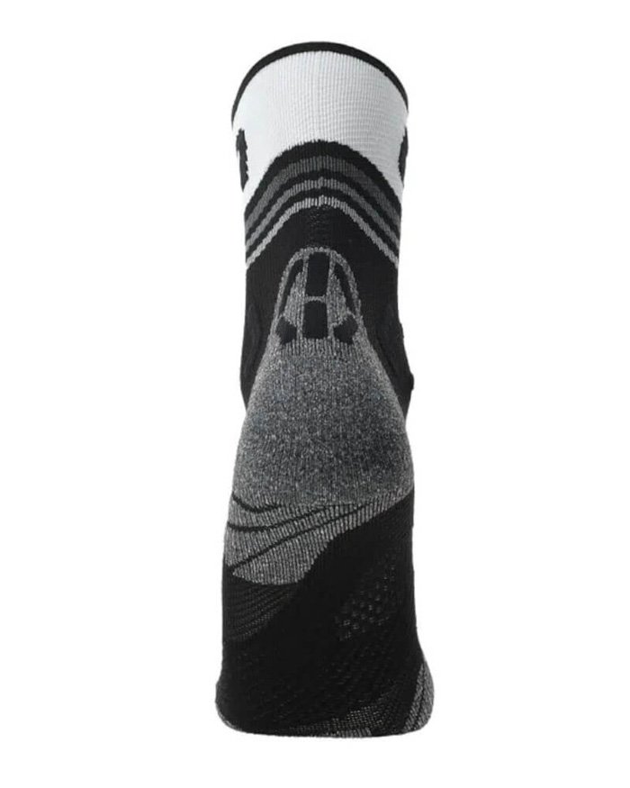Носки средней длины из трехмерной трикотажной ткани с микроканальной структурой, обеспечивающей охлаждение и воздухообмен. В этой модели использована технология ZeroCuff - она отличается отсутствием манжет, таким образом ничто не препятствует кровообращению, а вероятность отеков снижается. Двойная асимметричная повязка в средней части стопы и в области пятки обеспечивает компрессию и поддержку, кроме того, она хорошо впитывает пот. Стельки анатомической формы предотвращают натирание во время длительных спортивных нагрузок. Трехмерные уплотнения в области пятки смягчают ударную нагрузку на ахиллово сухожилие.