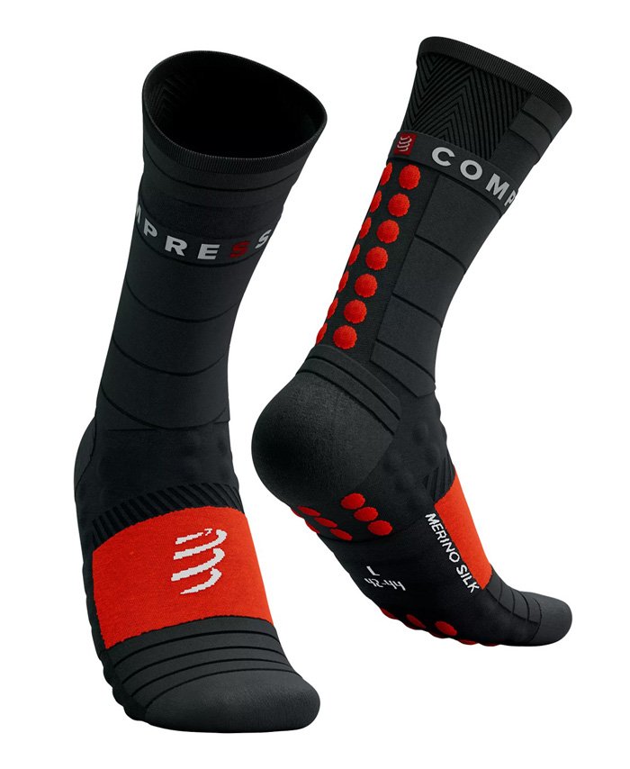 Термозащитный материал из мериносовой шерсти и шелка сохраняет тепло. Вентиляционные панели отводят влагу, оставляя ноги сухими. Трехмерные точки увеличивают сцепление с обувью и защищают внутреннюю лодыжку от ударов. Усиленная носочная часть предотвращает повреждение пальцев и появление синяков. Предусмотрены специальные зоны сжатия, которые улучшают кровообращение и уменьшают усталость ног. Опора свода стопы и эластичный ребристый воротник предотвращают смещение носка и образование складок.