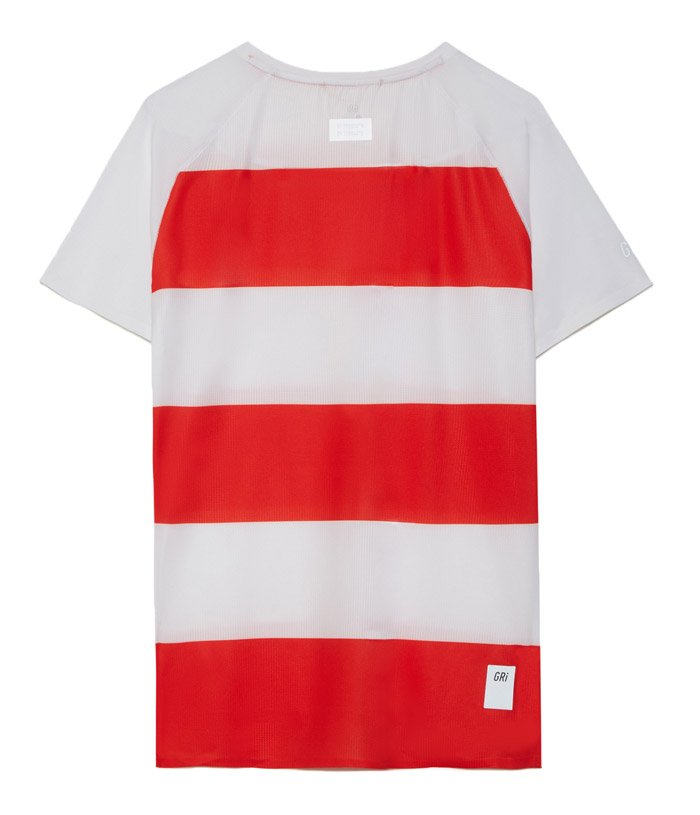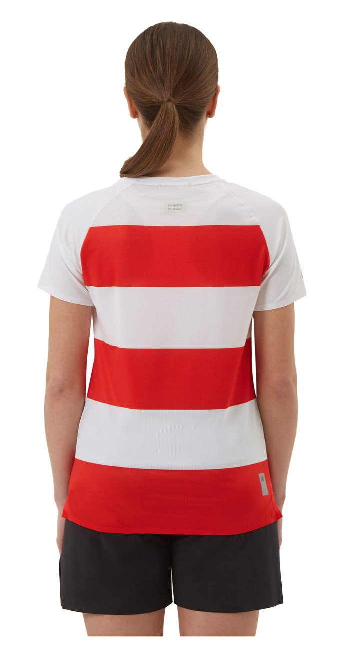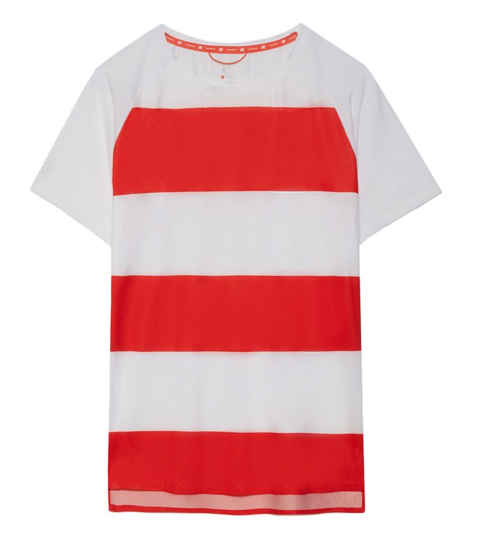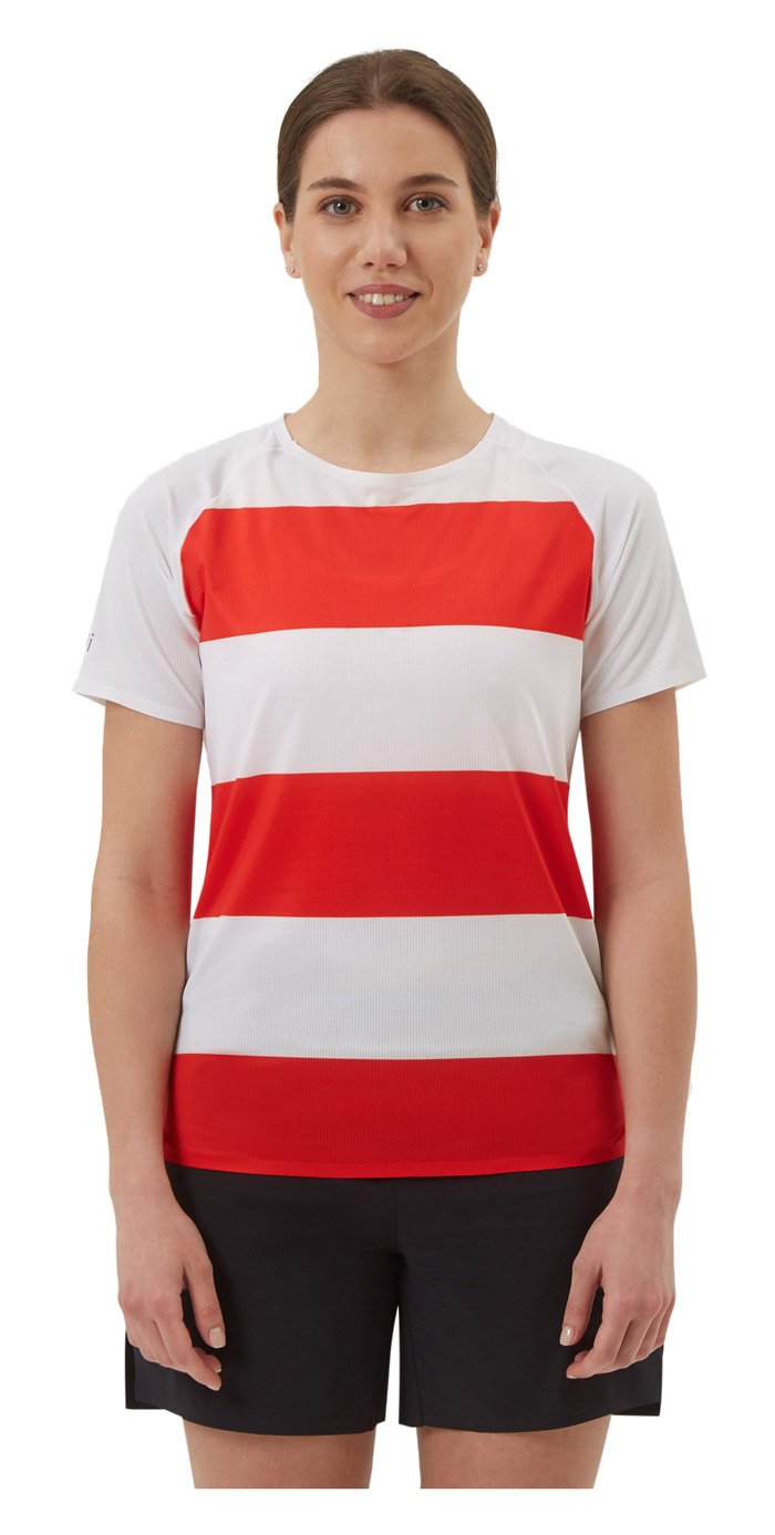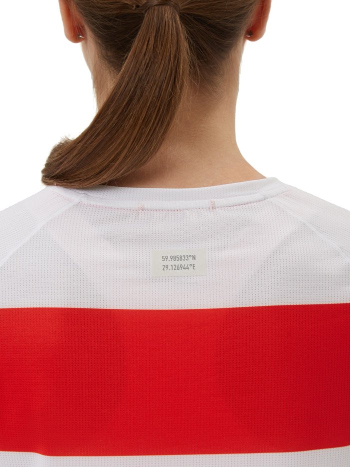 Футболка для бега с ярким красно-белым принтом, из тонкой воздухопроницаемой ткани. Дизайн серии Маяк символизирует ежегодную эстафету в Санкт-Петербурге.
