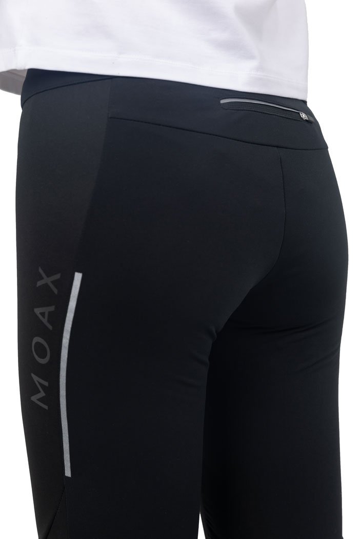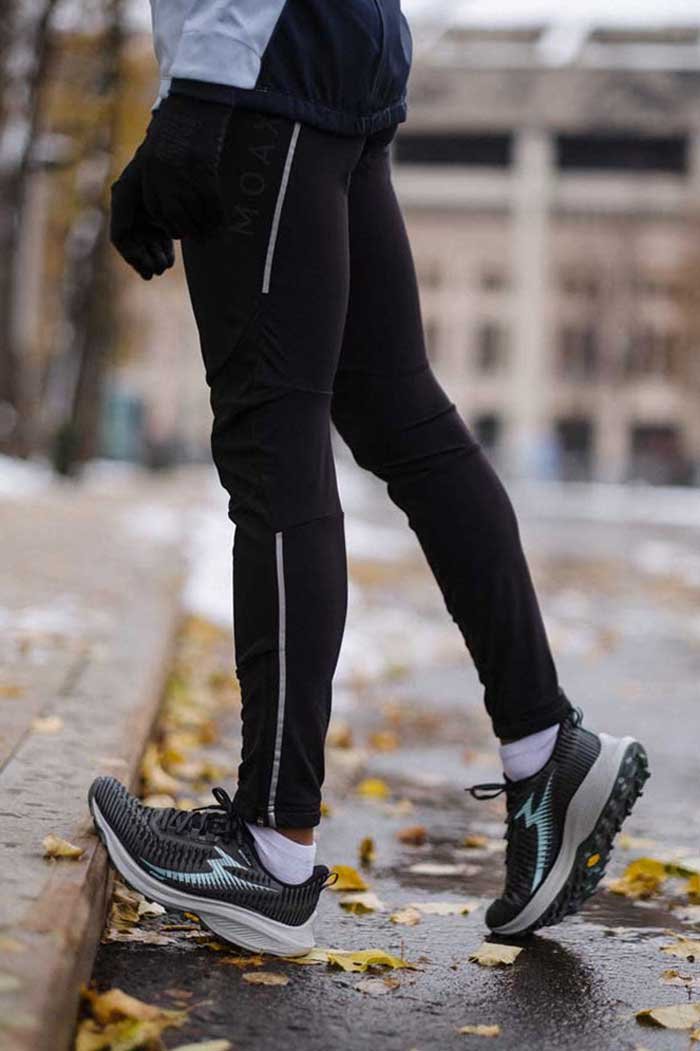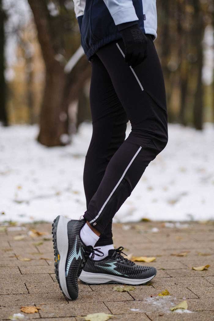 Пояс оснащен шнурком, позволяющим более точно отрегулировать посадку. Силиконовое покрытие внутри манжеты уменьшает скольжение вокруг лодыжки. В задний карман на молнии помещается телефон и другие необходимые мелочи. Молнии до середины голени позволяют быстро переодеться после тренировки. Светоотражающие элементы повышают безопасность тренировок в темное время суток.