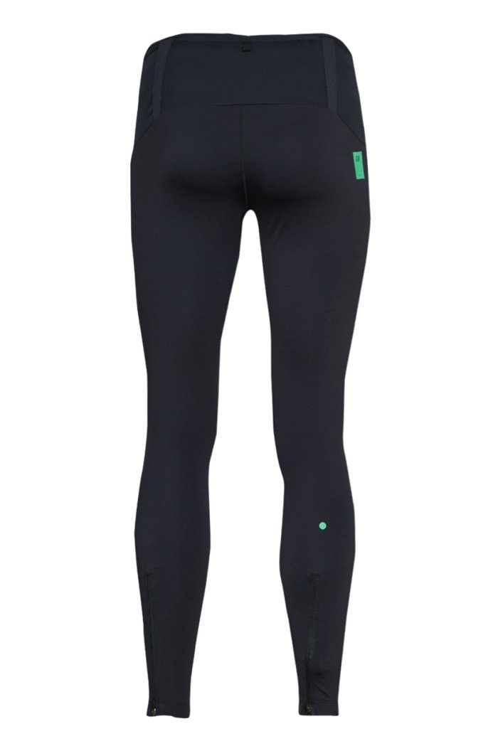 Трикотажная ткань из прочного нейлона с добавлением эластичного спандекса обладает устойчивостью к зацепкам и мягкой посадкой. Пояс оснащен шнурком для надежной фиксации. Молнии внизу штанин позволяют легко снимать и надевать тайтсы. Свеотоотражающие элементы повышают видимость в темное время суток.