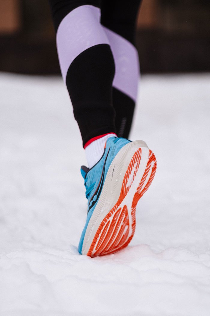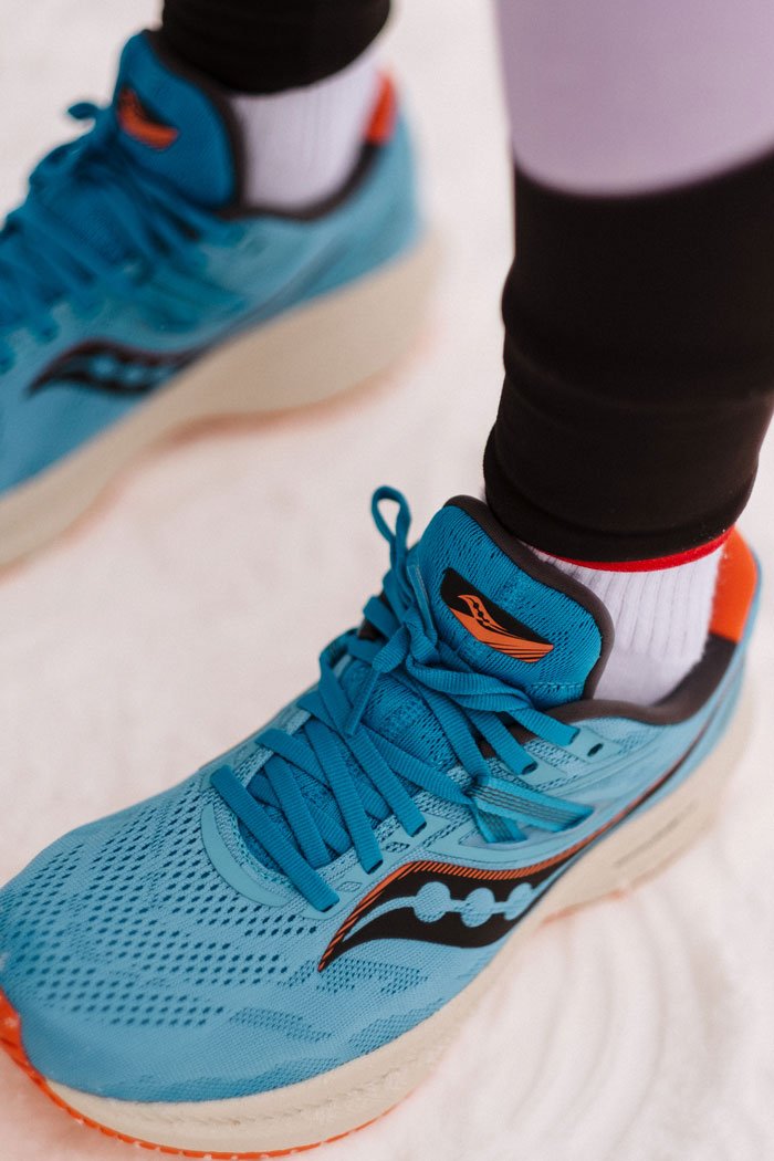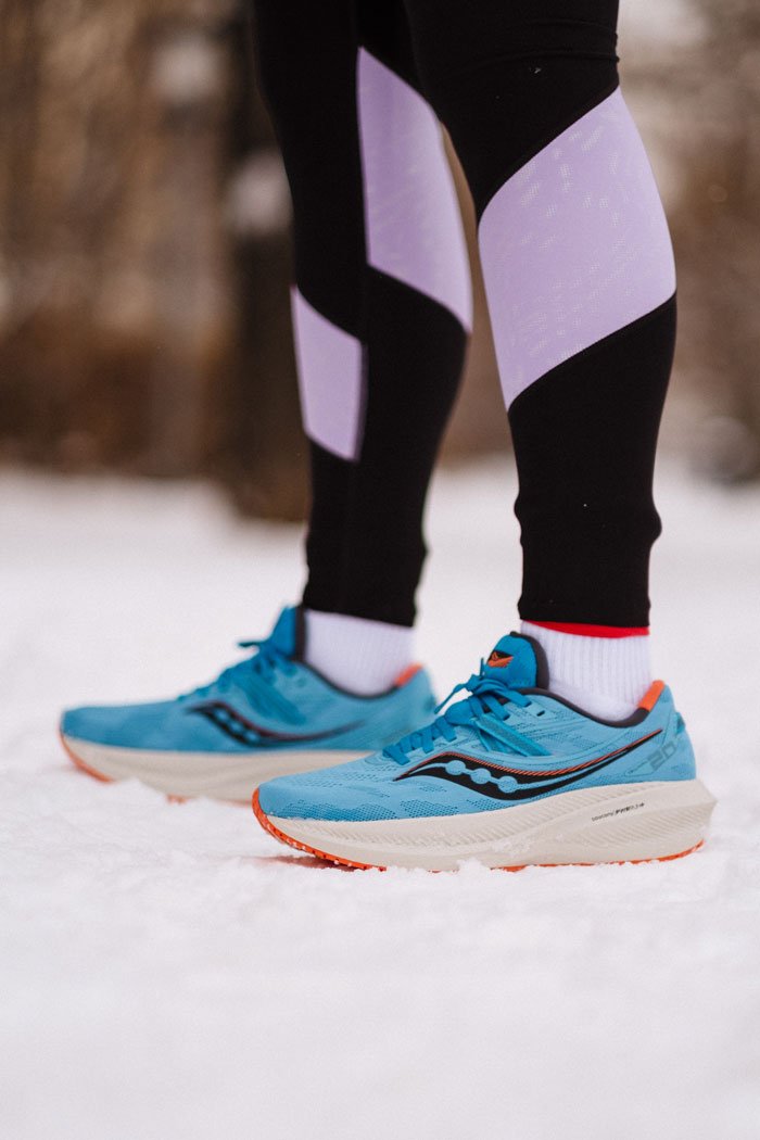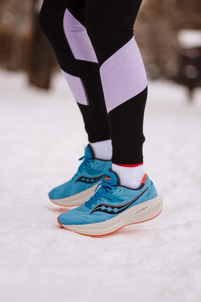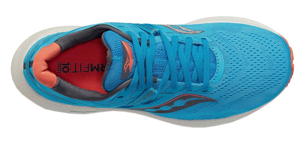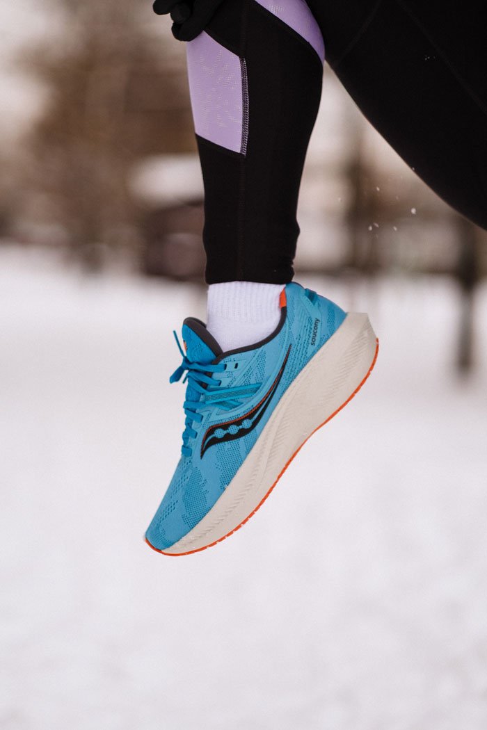 Обновленный верх дополнен фиксирующими лентами интегрированными в шнуровку для более плотной посадки. Материал верха стал плотнее, но сохранил превосходную воздухопроницаемость. В моделе Triumph 20 стелька изготовлена из того же материала, что и межподошва PWRRUN+, что создает дополнительную мягкость во время приземления.
